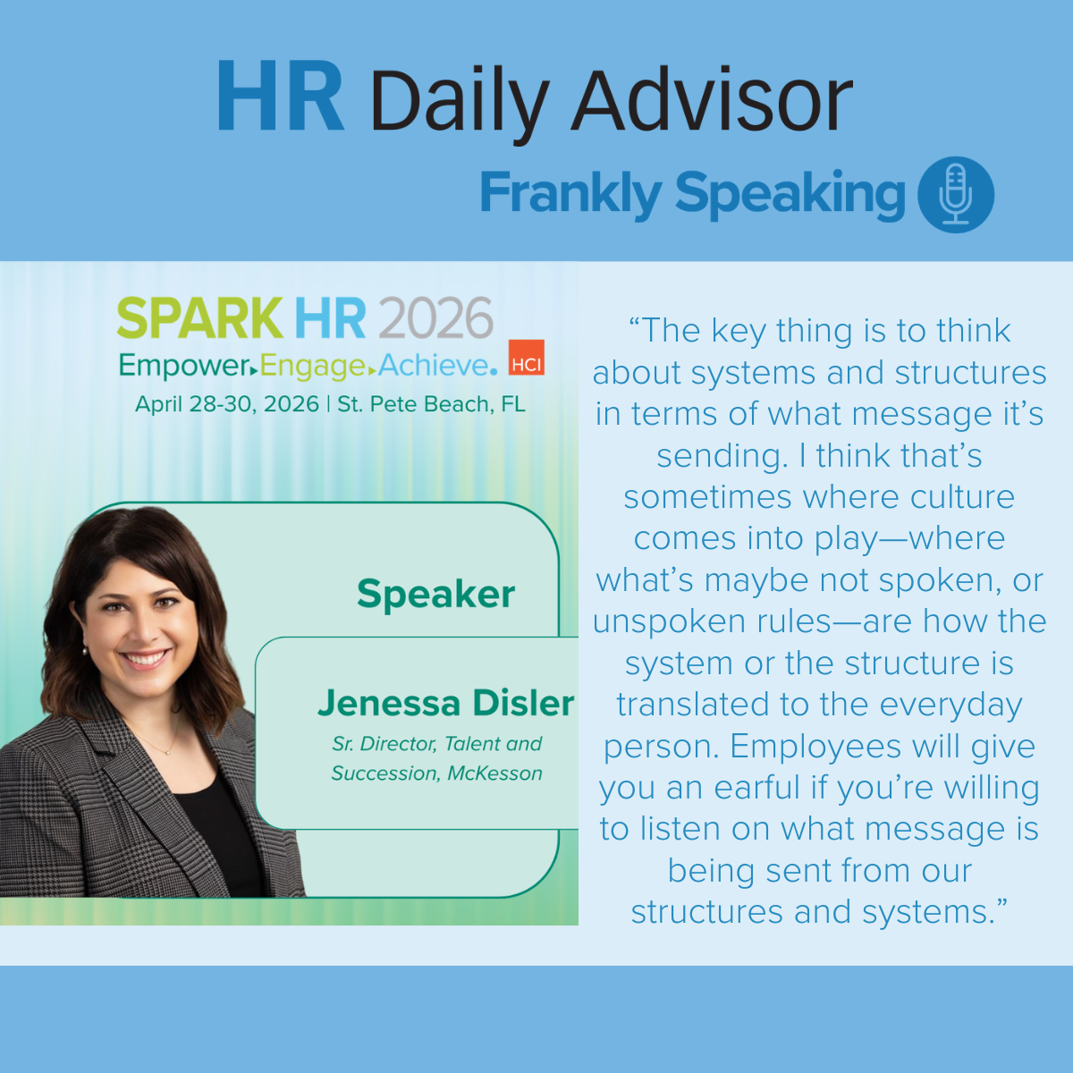 Want to learn more? Catch Jenessa Disler live at SPARK HR 2026, April 28–30, in St. Pete Beach, FL, for her full session: Designing AI Ready Leadership Cultures: How HR Builds Trust, Clarity, and Engagement at Scale.